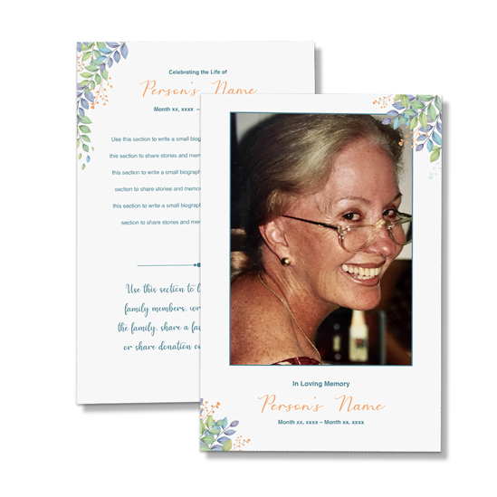 - Plenty of blank space on the back for a Bio, Remembered by, Song, Poem, Verse Mass Information (fully customizable)